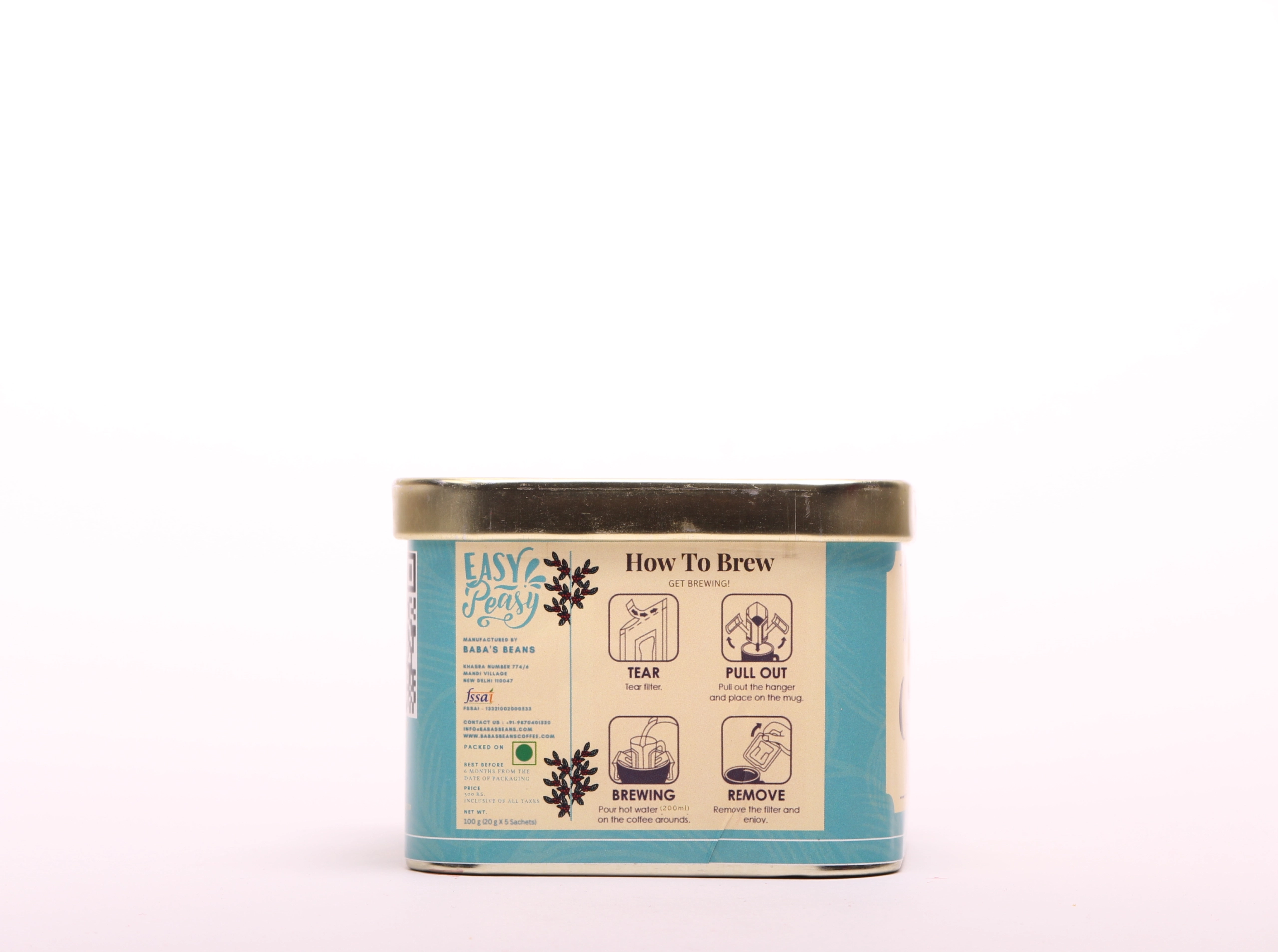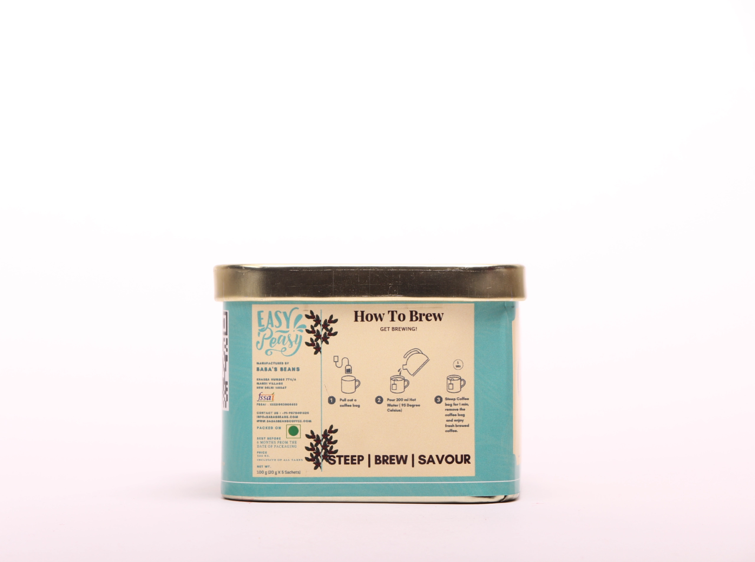 Each tin comes packed with five single-serve pour-over sachets (20 g each) of our signature roast rafted for a full-bodied, flavourful brew wherever you are.
