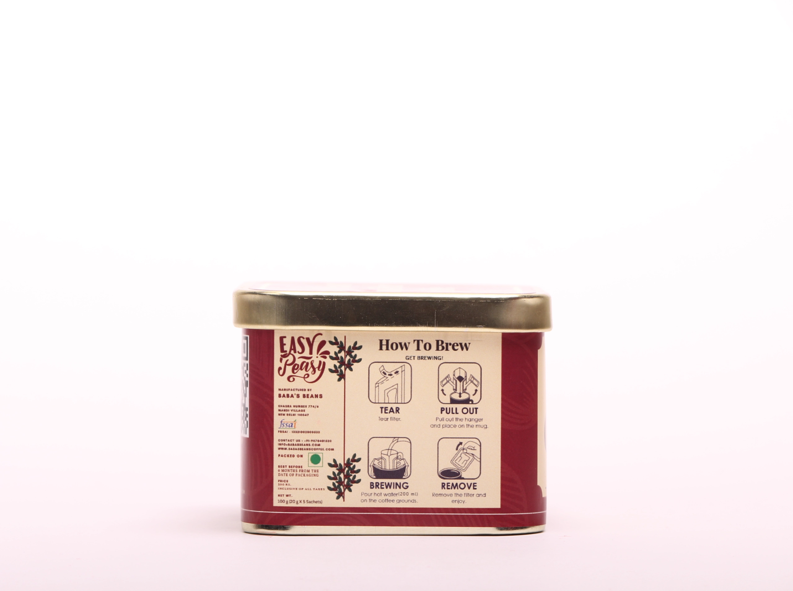Each tin comes packed with five single-serve pour-over sachets (20 g each) of our signature roast crafted for a full-bodied, flavourful brew wherever you are.